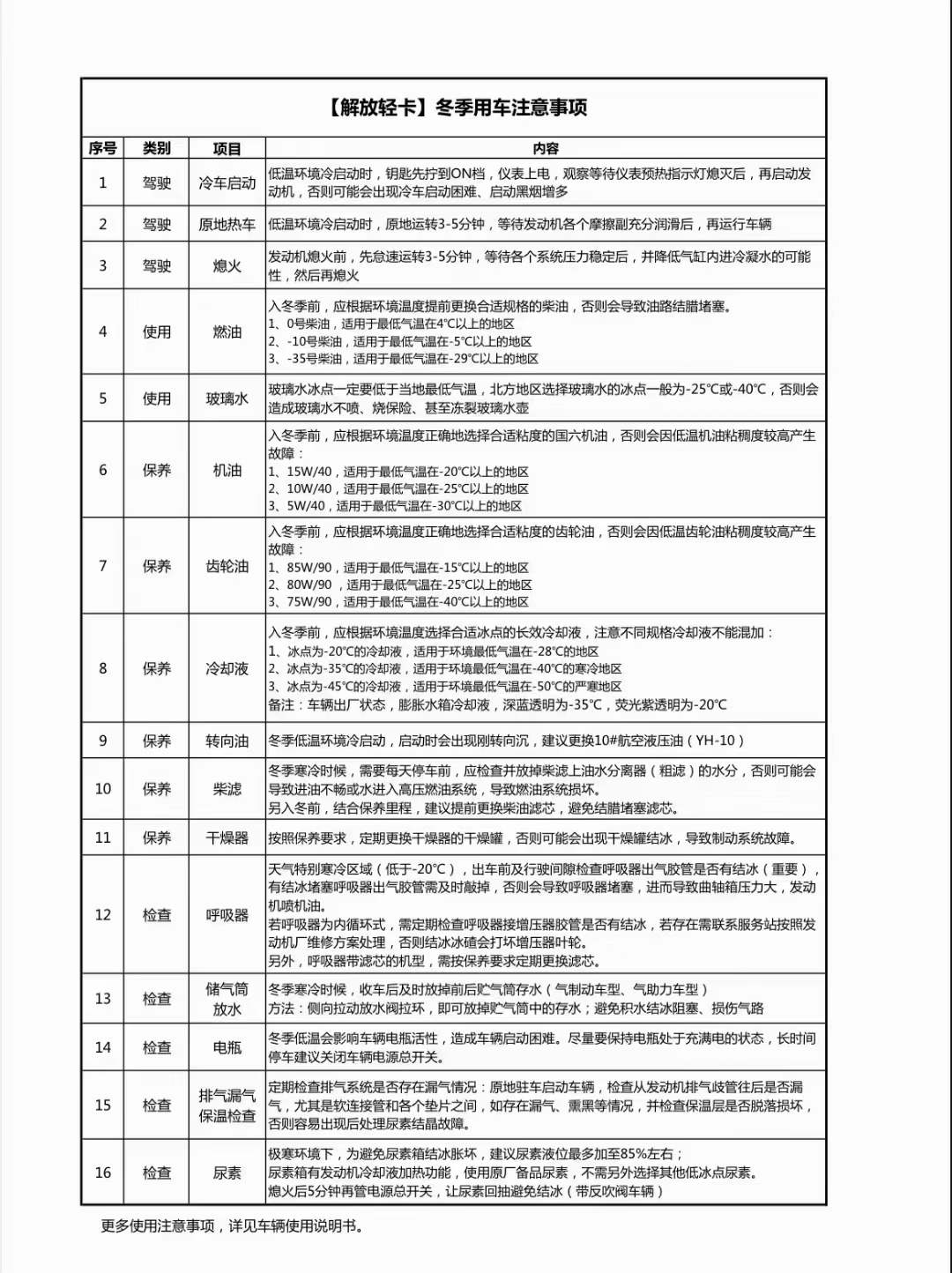 程力解放環(huán)衛(wèi)車溫馨提示:明天開始降溫,請及時更換-10號柴油,并檢查防凍液,玻璃水,機(jī)油,尿素是否需要添加和更換。